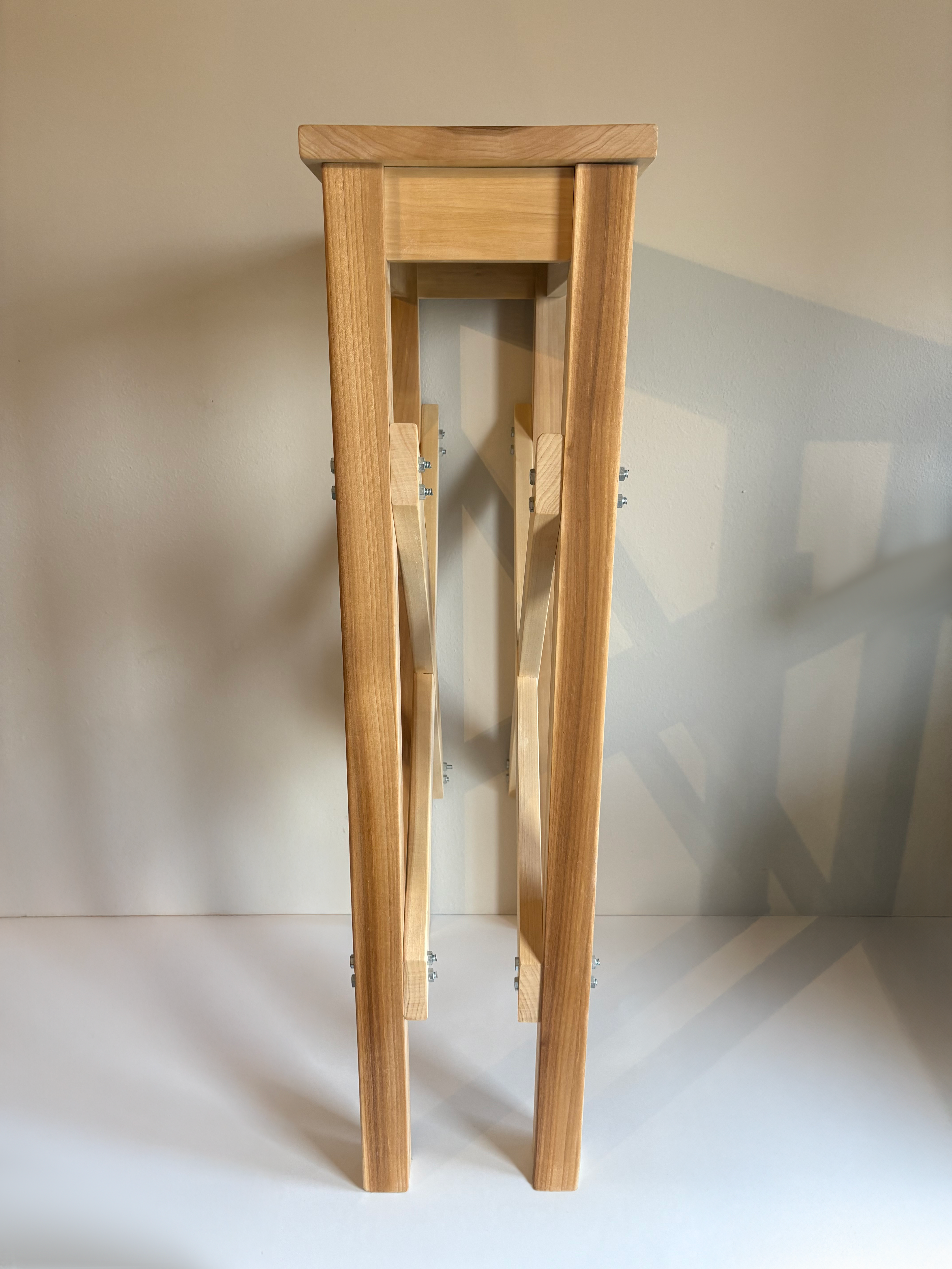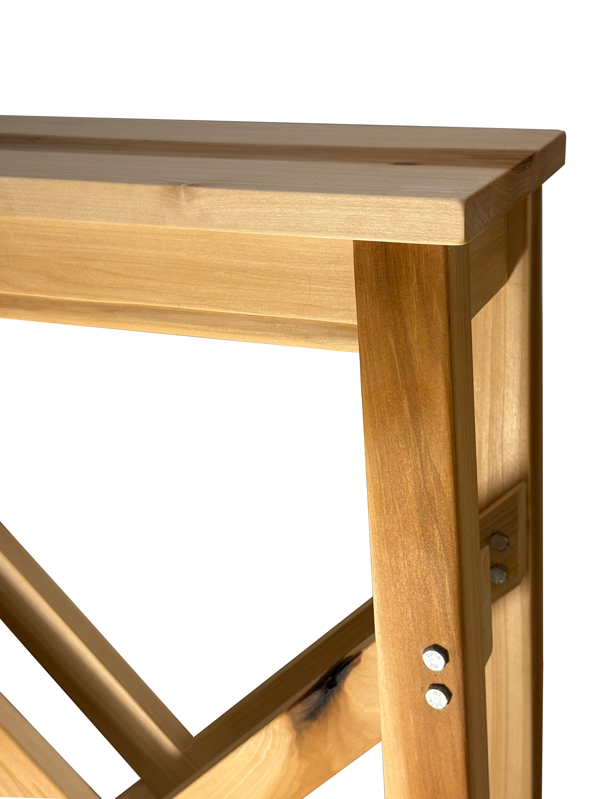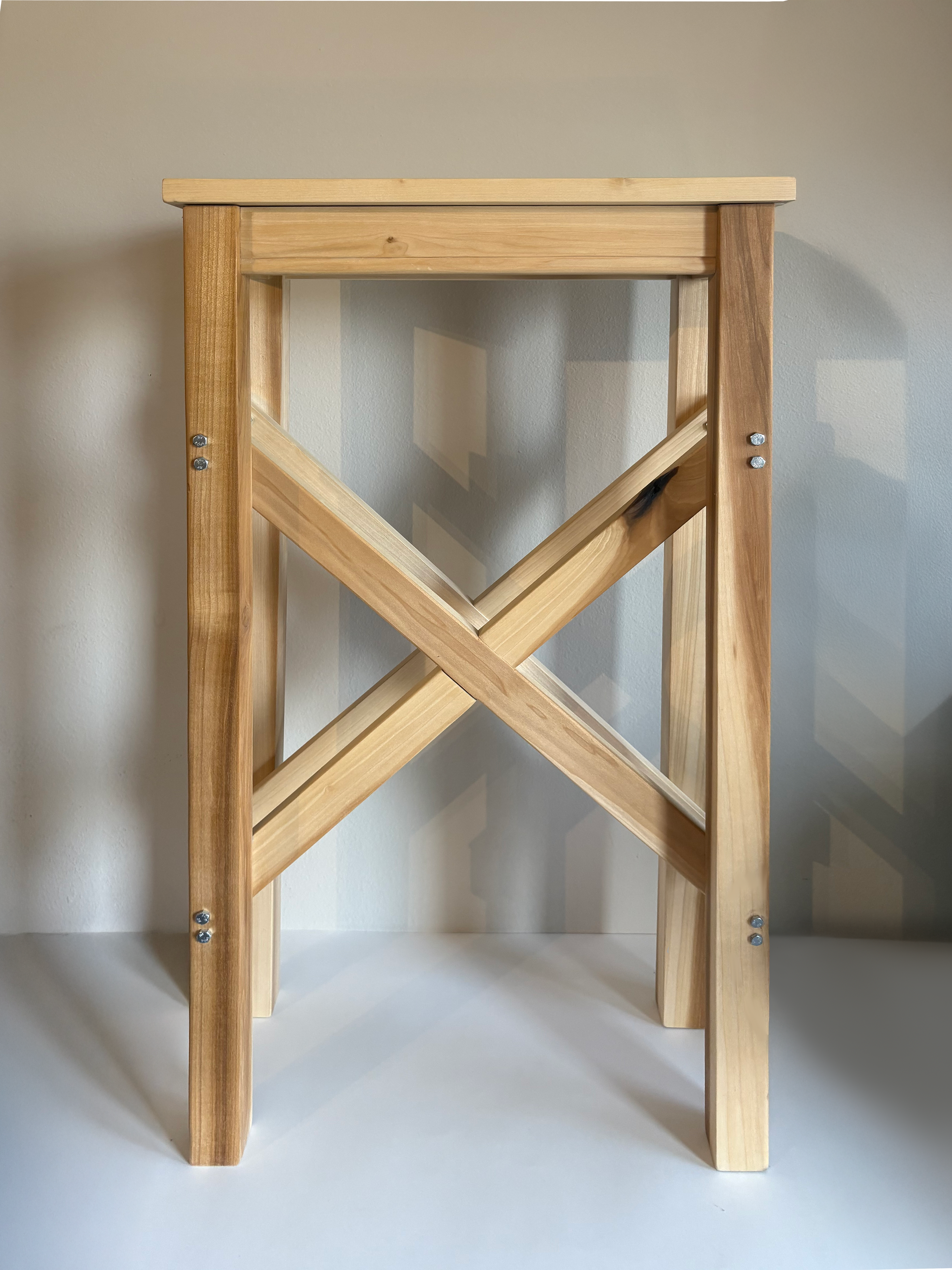 The first furniture piece I designed was an industrial-style key table. I chose wood with strong contrast along with beautiful grain patterns and knots. The table is clearly over-engineered, featuring two bolted cross braces that reinforce the legs and give the piece a rugged look.